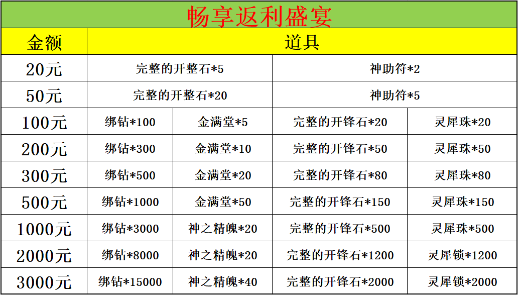 1、活动期间内,每日充值3000元可领取之前所有档位奖励。(注:充值超3000元可联系客服小精灵QQ:97980930)